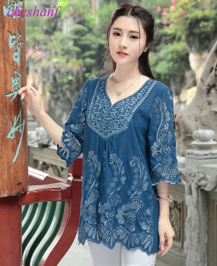 BEST QUALITY 2020 Casual Summer Women Blouses Vintage Embroidery Blouse Loose Floral Boho Tops Womens Clothing P