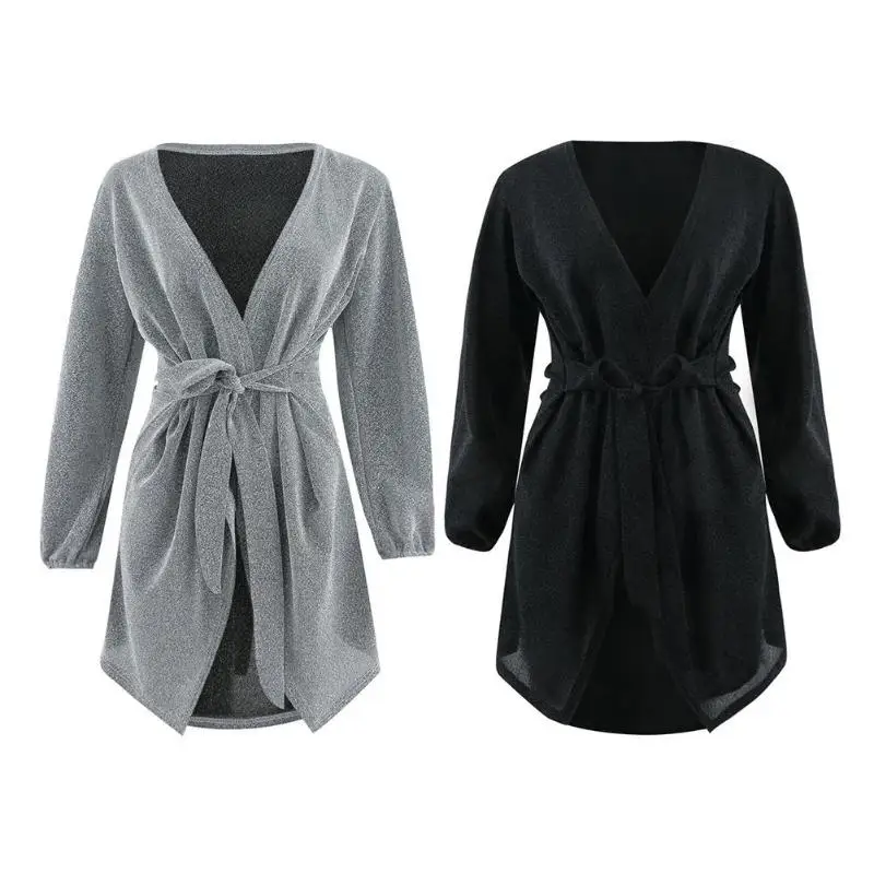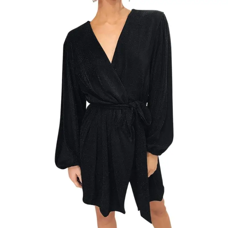 Women Sexy V-Neck Tunic Dress Irregular Hem Fashion Long Sleeve Loose Party Clothing with Belt